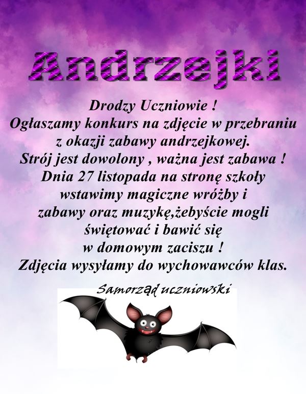 Konkurs Andrzejkowy 19-11-2020 21:34 A A A Serdecznie zapraszamy wszystkich uczniów do udziału w konkursie na najciekawszy strój andrzejkowy. Do zobaczenia 27 listopada na stronie szkoły! Samorząd Uczniowski ZOBACZ GALERIE