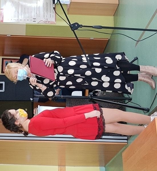 Klaudia specjalnie przybyła do szkoły wraz ze swoją mamą na tę ważną uroczystość. Przyjęła gratulacje od pani dyrektor oraz brawa od obecnych uczniów i nauczycieli nauki stacjonarnej.