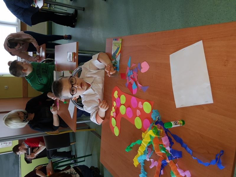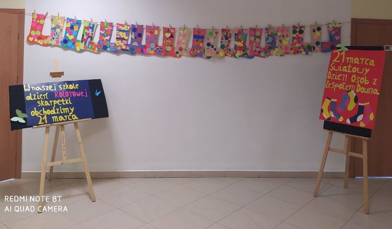 Na korytarzu naszej szkoły można podziwiać kolorowe skarpety wykonane przez uczniów w związku z celebracją święta Zespołu Downa oraz prace konkursu wiosennego.