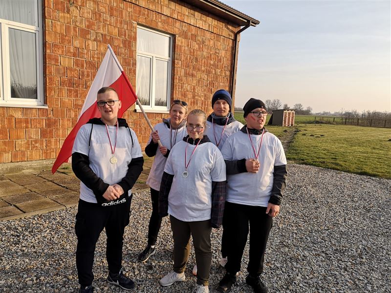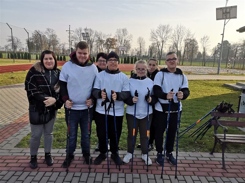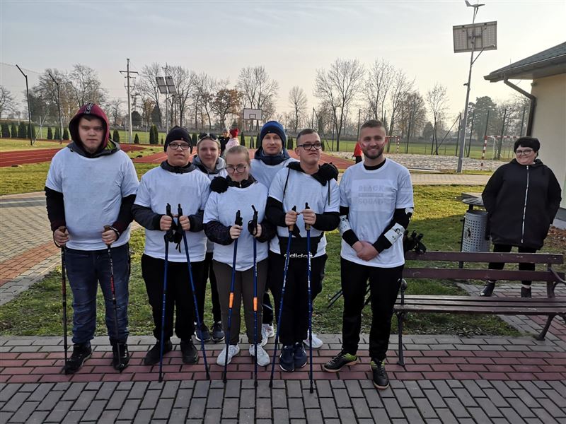 Grupa uczniów wraz z nauczycielami ze szkoły z Erminowa wzięła udział w II Gminnym Niepodległościowym Marszu Nordic Walking o Puchar Wójta Gminy Rybno.