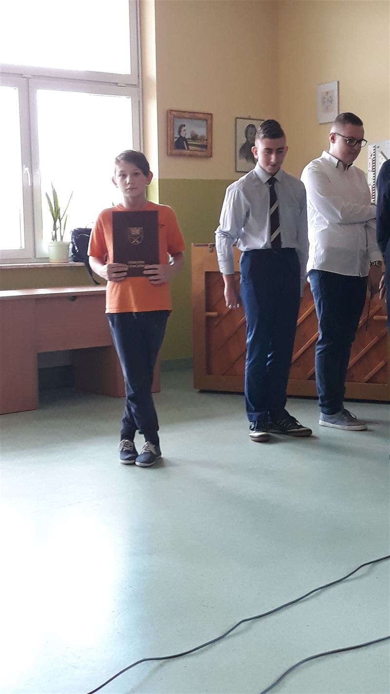 Na zakończenie pani Dyrektor Renata Karaś wręczyła uczniowi klasy IV Marcinowi Mika stypendium Starosty Sochaczewskiego za wysokie osiągnięcia w nauce w I półroczu 2018\2019.