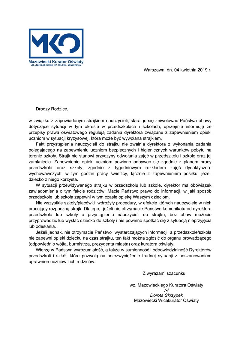 w związku z zapowiadanym strajkiem nauczycieli, starając się zniwelować Państwa obawy dotyczące sytuacji w tym okresie w przedszkolach i szkołach, uprzejmie informuję że przepisy prawa oświatowego regulują zadania dyrektora związane z zapewnieniem opieki uczniom w sytuacji kryzysowej, która może być wywołana strajkiem.