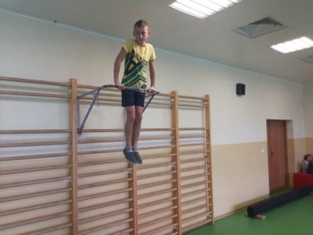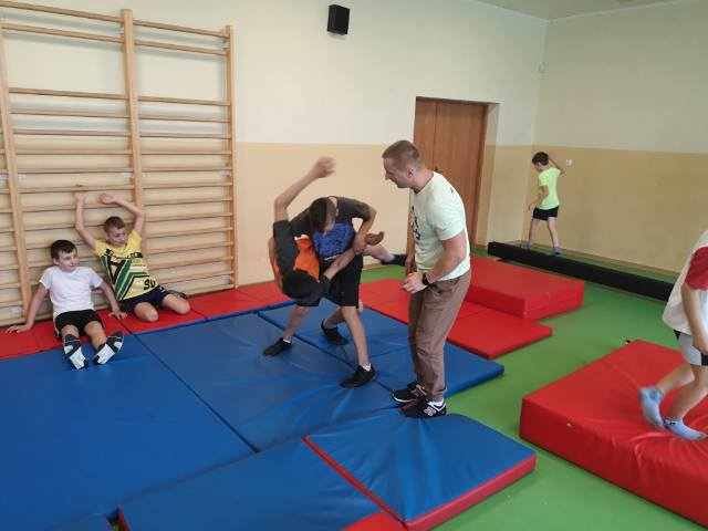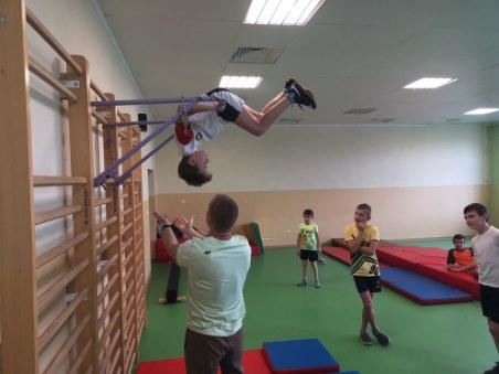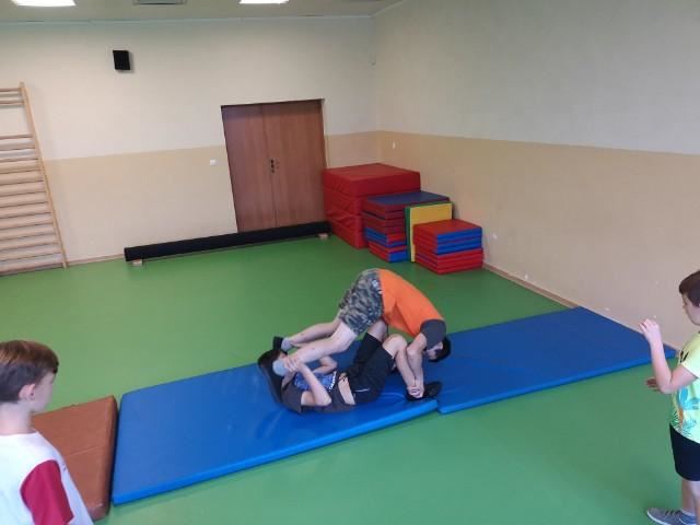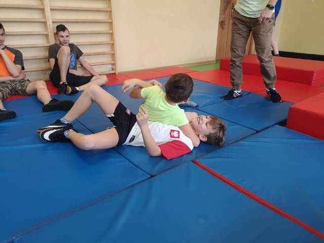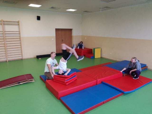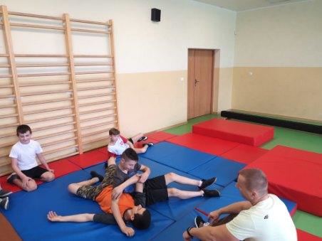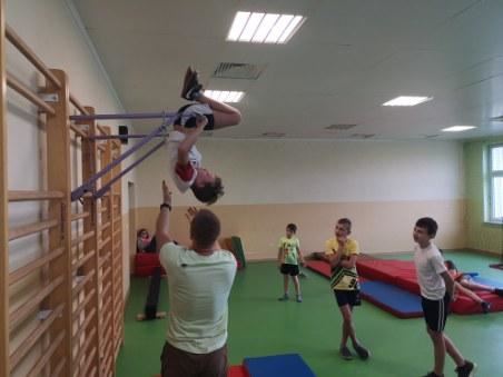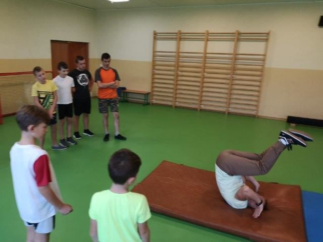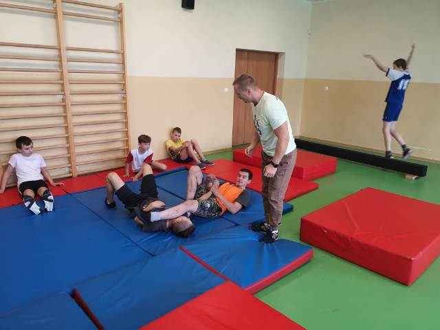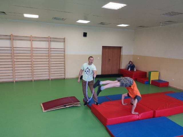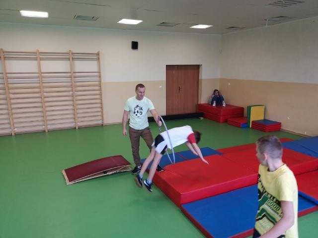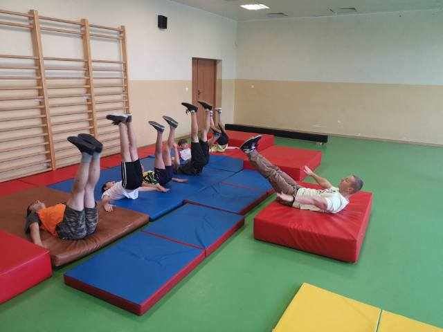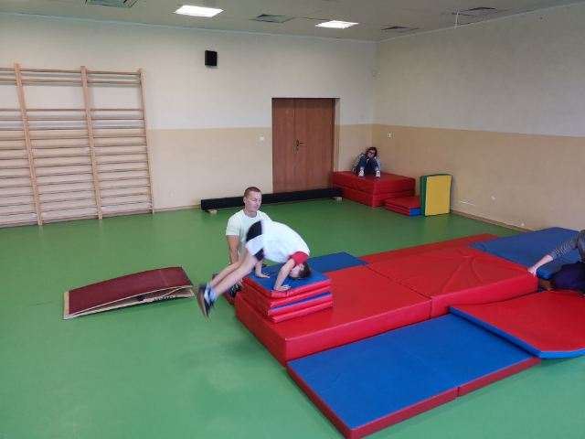 Pod czujnym okiem nauczycieli wychowania fizycznego chłopcy wykonują trudne ćwiczenia z zakresu gimnastyki sportowej, akrobatyki oraz elementy sztuk walk i samoobrony. W trakcie zajęć udało się także zrealizować wymyk i odmyk na drążku gimnastycznym oraz wprowadzić wybrane piramidy gimnastyczne. Każdy z uczniów wykonuje wszystkie ćwiczenia na miarę swoich możliwości.