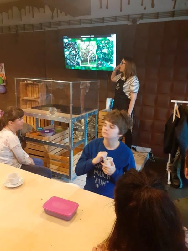 Uczestnicy zapoznali się z procesem produkcji czekolady. Ze szkoły wyjechaliśmy o 8:55, na miejsce dotarliśmy o godz. 10:10. Po wejściu do budynku Manufaktury zostawiliśmy nasze ubrania w szatni. Następnie zajęliśmy miejsca na sali. Zachwyt nasz wzbudził pokaz multimedialny, z którego dowiedzieliśmy się, że z 1 owocu kakaowca można zrobić jedną czekoladę.