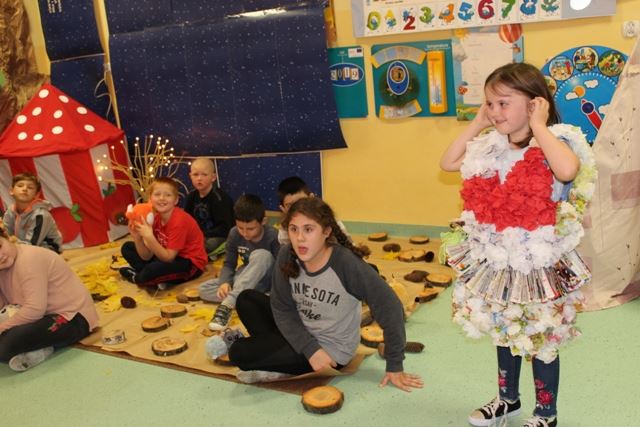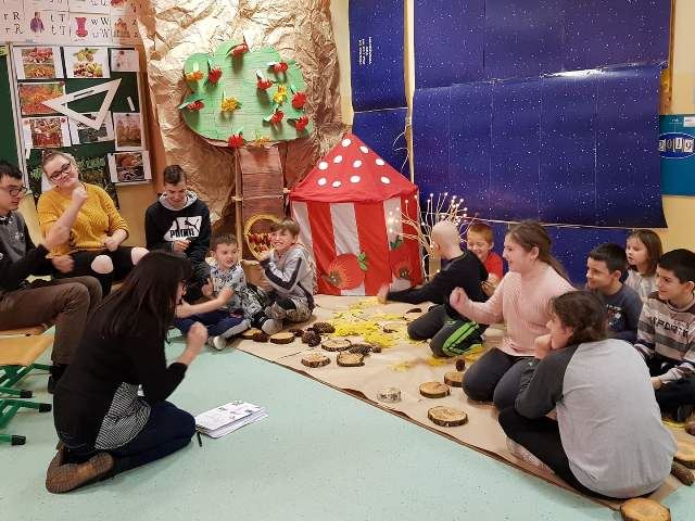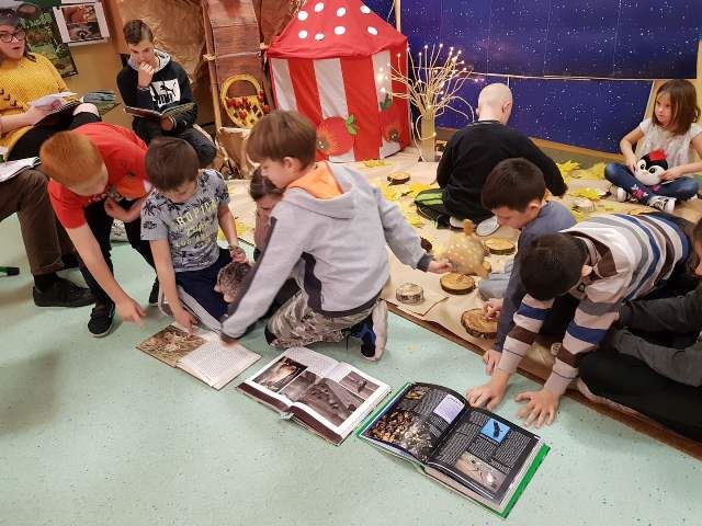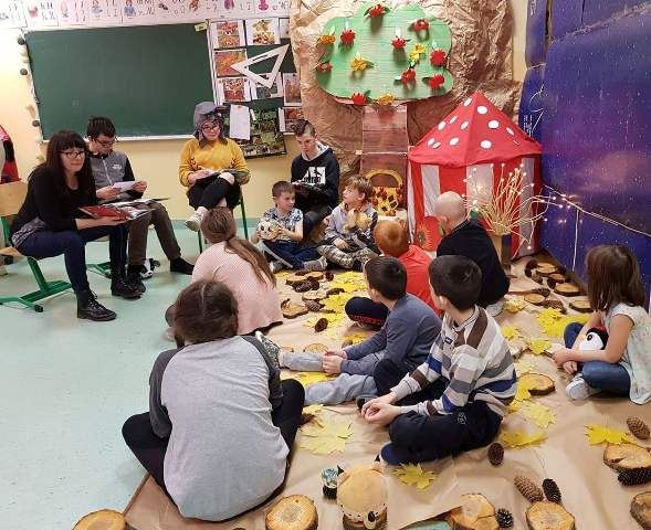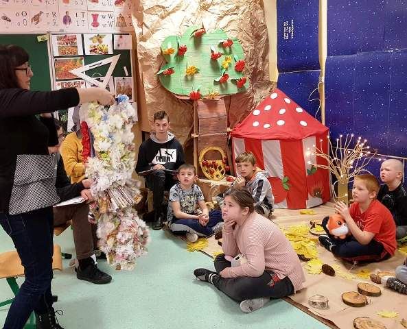Dzieciaki urządziły w swojej sali zaczarowany Leśny Zakątek Słodziaków z materiałów użytych wtórnie w ramach recyclingu. Młodzież wraz z panią bibliotekarką przeczytała z podziałem na role opowiadanie „Latająca mysz”, przeprowadziła też zabawy, zadania i prace plastyczne, które dostarczyły dzieciom mnóstwo pozytywnych emocji. Na zakończenie zajęć odbyła się mini-dyskoteka z najnowszymi przebojami Gangu Słodziaków!