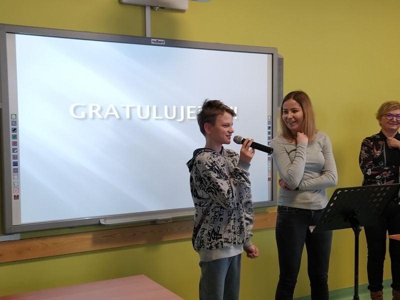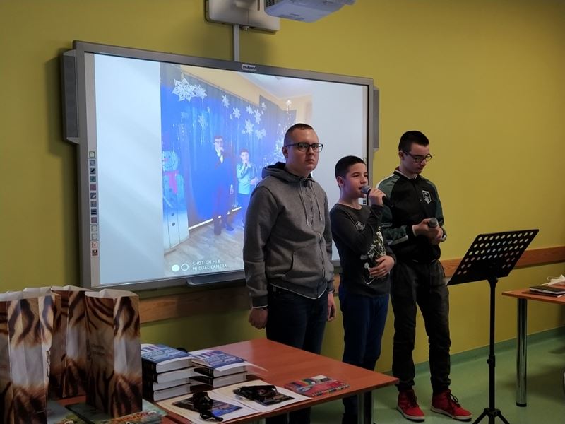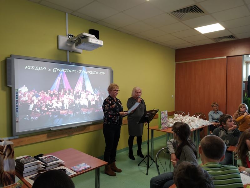 Laureaci konkursu piosenki w Żyrardowie zaprezentowali nam na żywo swoje wykonanie pastorałek. Połączyliśmy się też ze stroną internetową Fundacji ABCXXI Cała Polska czyta dzieciom, na której zamieszczono link do prezentacji naszych uczniów o szacunku, która zajęła III miejsce w ogólnopolskim konkursie związanym z projektem „Wychowanie przez czytanie”. Odbyło się także uroczyste wręczenie dyplomów i nagród.