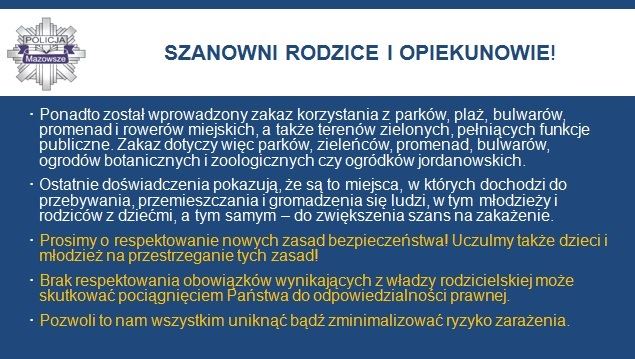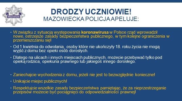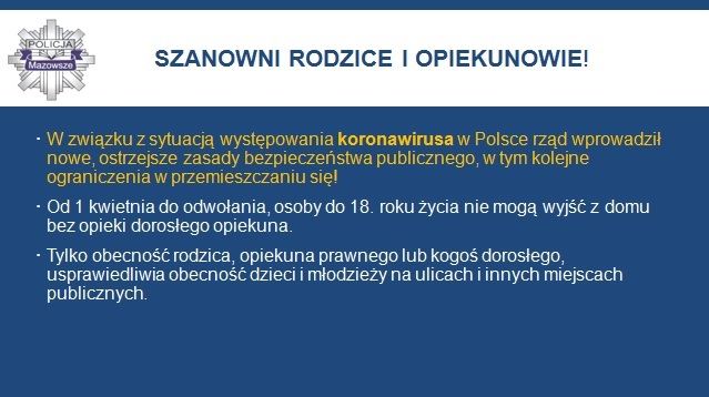 Od 1 kwietnia do odwołania, osoby które nie ukończyły 18. roku życia nie mogą wyjść z domu bez opieki osób dorosłych.
