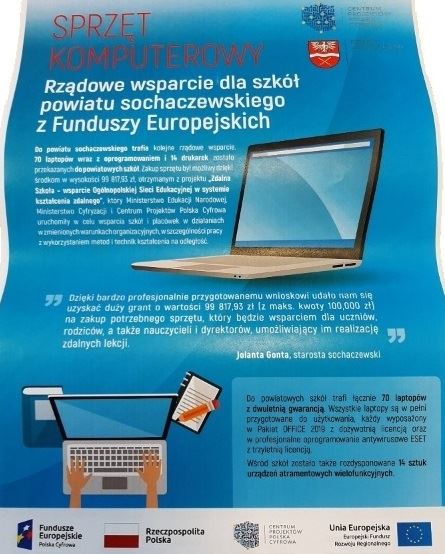 Zespół Szkół Specjalnych w Erminowie otrzymał ze Starostwa Powiatowego w Sochaczewie 6 laptopów i 2 drukarki, w celu usprawnienia zdalnego nauczania. Sprzęt ten został przekazany w ramach projektu „Zdalna Szkoła – wsparcie Ogólnopolskiej Sieci Edukacyjnej w systemie kształcenia zdalnego”, który Ministerstwo Edukacji Narodowej, Ministerstwo Cyfryzacji i Centrum Projektów Polska Cyfrowa uruchomiły w celu wsparcia szkół i placówek w działaniach w zmienionych warunkach organizacyjnych, w szczególności pracy z wykorzystaniem metod i technik kształcenia na odległość.